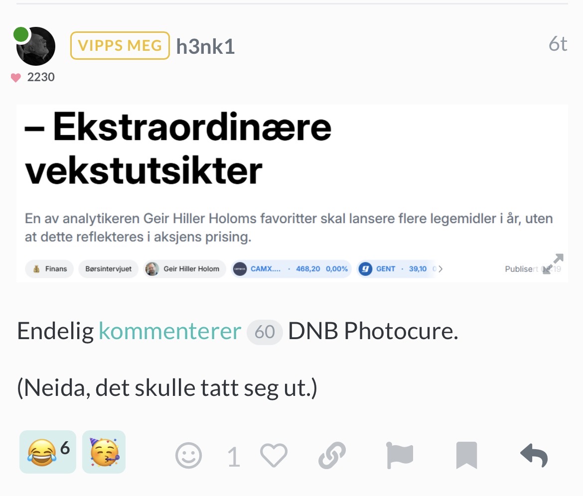 Jeg trodde vi skulle unngÄ et fall ned til dette nivÄet, men har helt hvilepuls selv, nÄr man vet at PHO har 100 millioner pÄ vei inn mot en marketcap pÄ 1,8 milliarder pÄ fredagsclose.