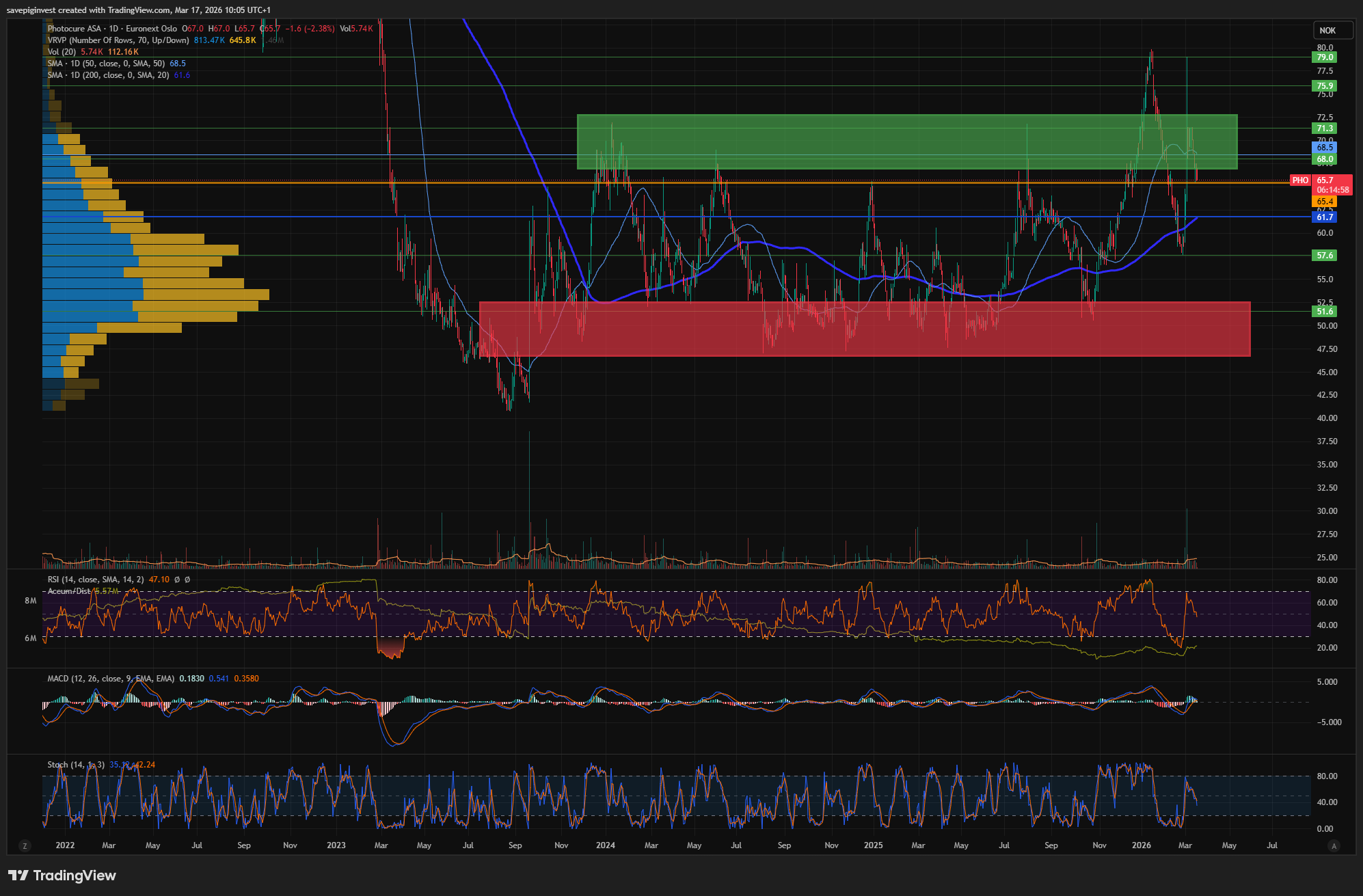Hvis man ser pÄ rsi, og den ogsÄ denne gangen bare holdes i en skrutvinge nedover uten at det kommer inn nye kjÞpere, sÄ er det nesten ingen bunn innenfor den vanlige trading rangen pÄ hvor dypt aksjen kan falle hvis 65 ryker. Man har 200 dager snitt et stykke under her, det er 61,7