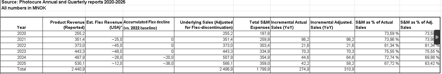Fra 2020 til 2025 har Photocure brukt omtrent 1,8 milliarder kroner pÄ S&M. I samme periode har produktomsetningen (akkumulert) kun Þkt med 275 millioner kroner.