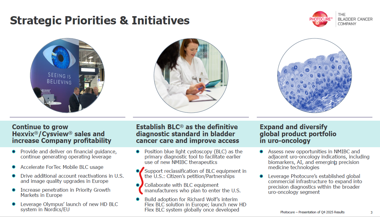 I tillegg begrenser ikke FDAs beslutning tilgangen til det amerikanske markedet. Photocure er fortsatt aktivt engasjert med, og støtter, flere enhetsprodusenter som forfølger etablerte alternative regulatoriske veier. Vi er fortsatt sikre på at disse veiene fortsetter å muliggjøre innovasjon, konkurranse og pasienttilgang, samtidig som de er i samsvar med regulatoriske forventninger.