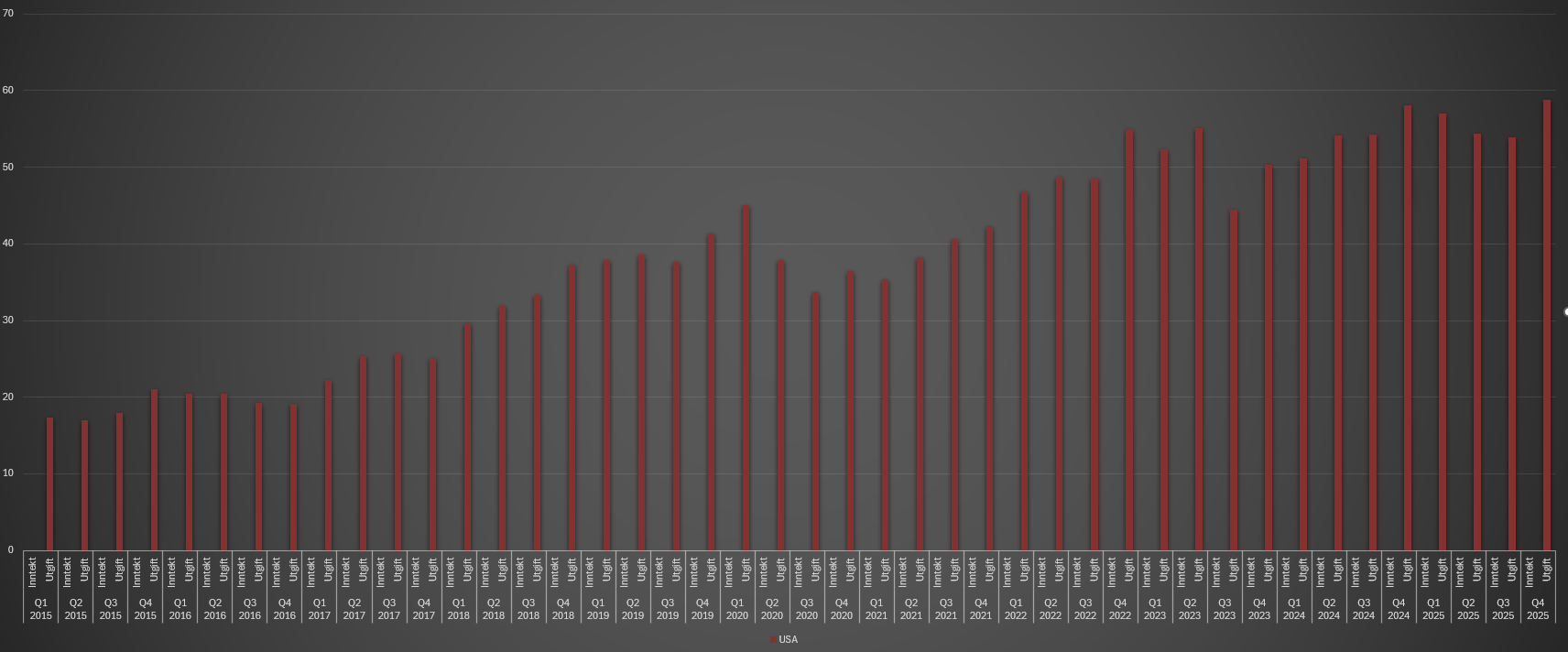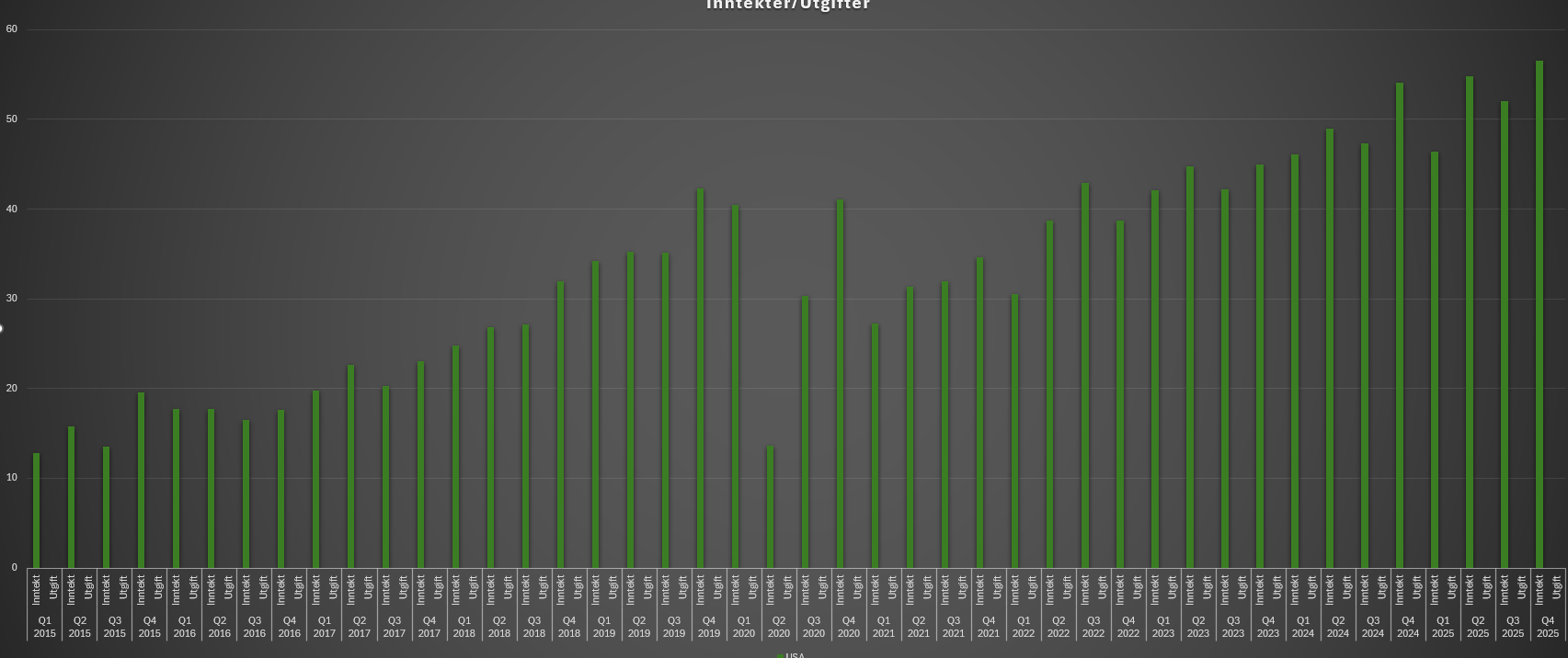 Her er totale utgiften i USA siden 2015. Disse var oppe i 55 mil i kvartalet allerede i 2022. Etter dette har det lagt mellom 50-60 ish mil i 13 kvartal, med variasjoner.