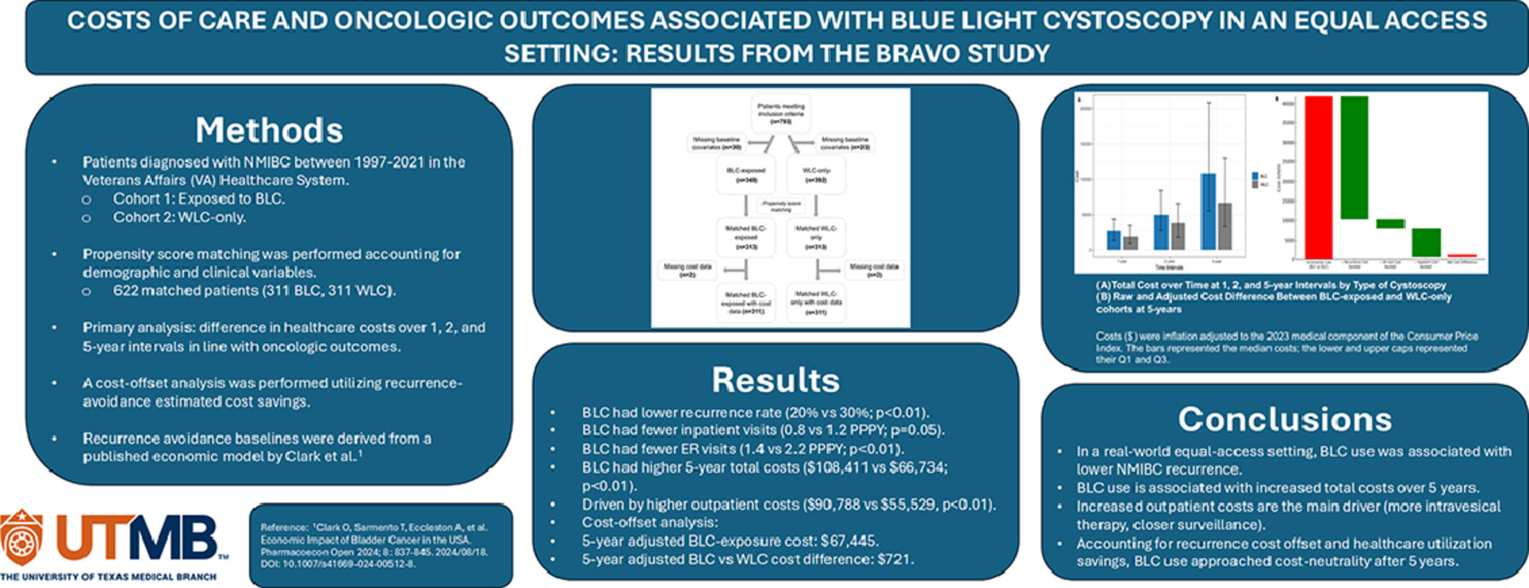 In an equal-access setting, BLC exposure was associated with higher 5-year costs, largely driven by outpatient care. However, lower recurrence rates reduced the net cost difference, resulting in near cost neutrality. These findings highlight the trade-off between higher upfront costs and improved recurrence outcomes when incorporating BLC into NMIBC management.