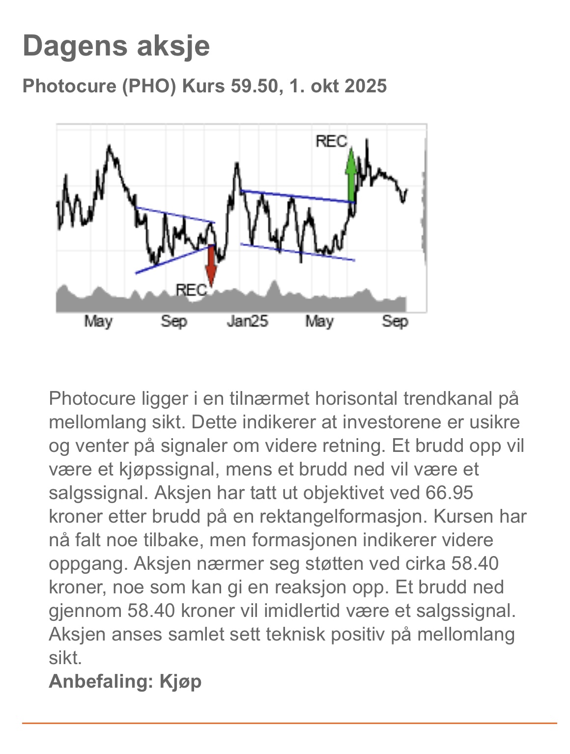 Kursen har nå falt noe tilbake, men formasjonen indikerer videre oppgang. Aksjen nærmer seg støtten ved cirka 58.40 kroner, noe som kan gi en reaksjon opp.