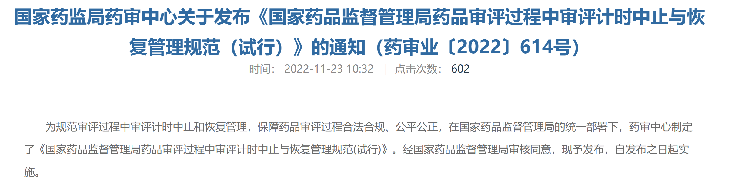Melding fra Nasjonalt legemiddelvurderingssenter under Statens legemiddeltilsyn om utstedelsen av âForskrifter for hĂ„ndtering av stans og gjenopptakelse av tidsberegning under vurderingsprosessen for legemiddelgodkjenning (prĂžveversjon)â
