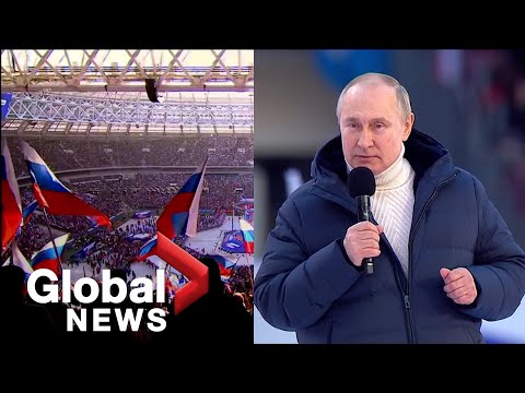 Moscow police said more than 200,000 people were in and around the Luzhniki stadium for the celebration marking the eighth anniversary of Russia’s annexation of the Crimean peninsula, seized from Ukraine.