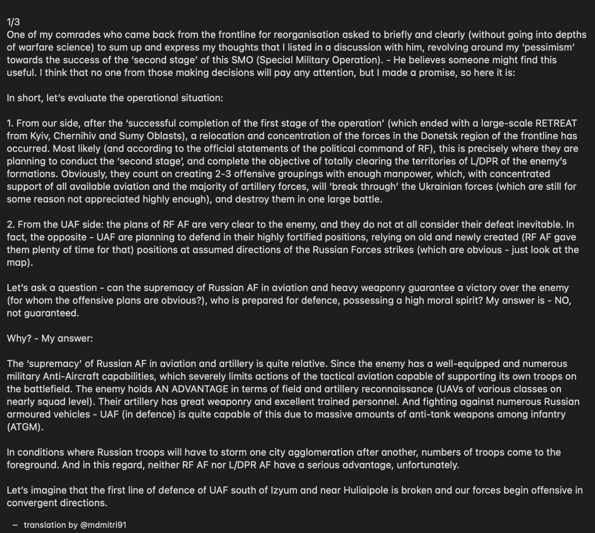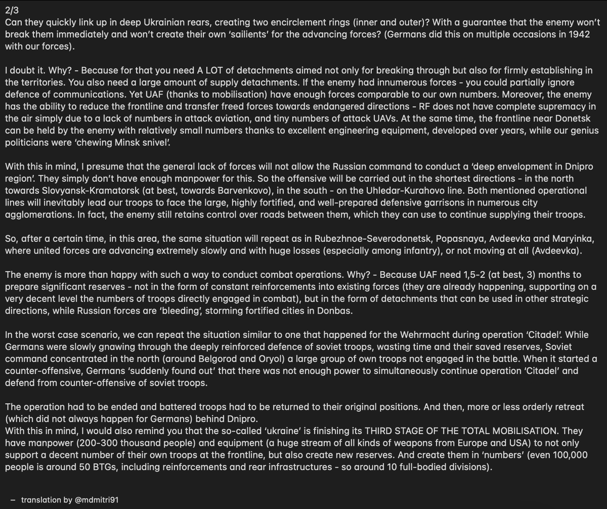 Her en oversettelse av Igor Girkins analyse av hvordan han tror den nye offensiven i øst blir å gå for Russland, kort sagt så er han pessimistisk. Det har blitt postet klipp av Igor Girkin fra russisk TV før og han er FSB offiseren som ble sendt til Donbas i 2014 for å starte “borgerkrigen”.