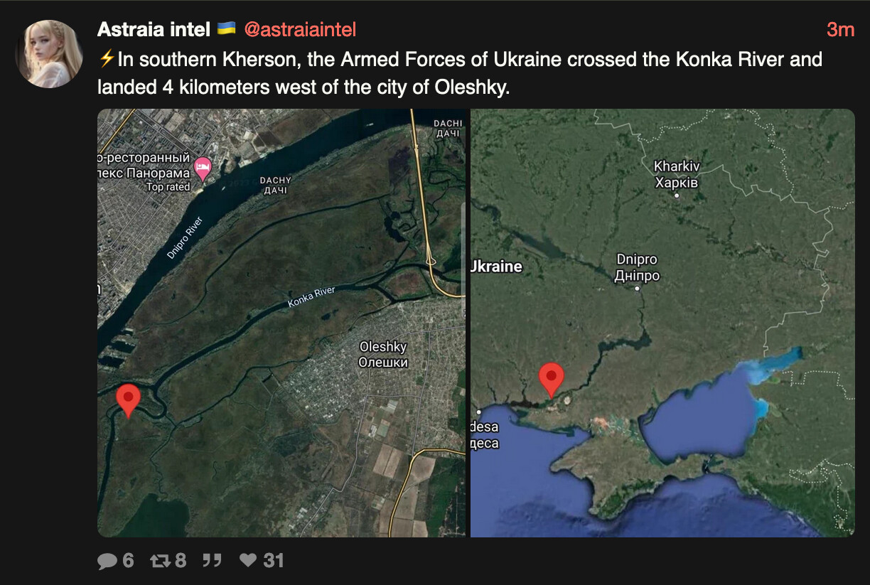 Jeg venter på faktisk info før jeg tror noe på et større ukrainsk angrep nå. Russiske kilder kommer først med info, men de fucker gjerne med infoen. Så kommer ukrainsk propaganda, så kommer skikkelig osint. Gjerne 3-7 dager forsinket.