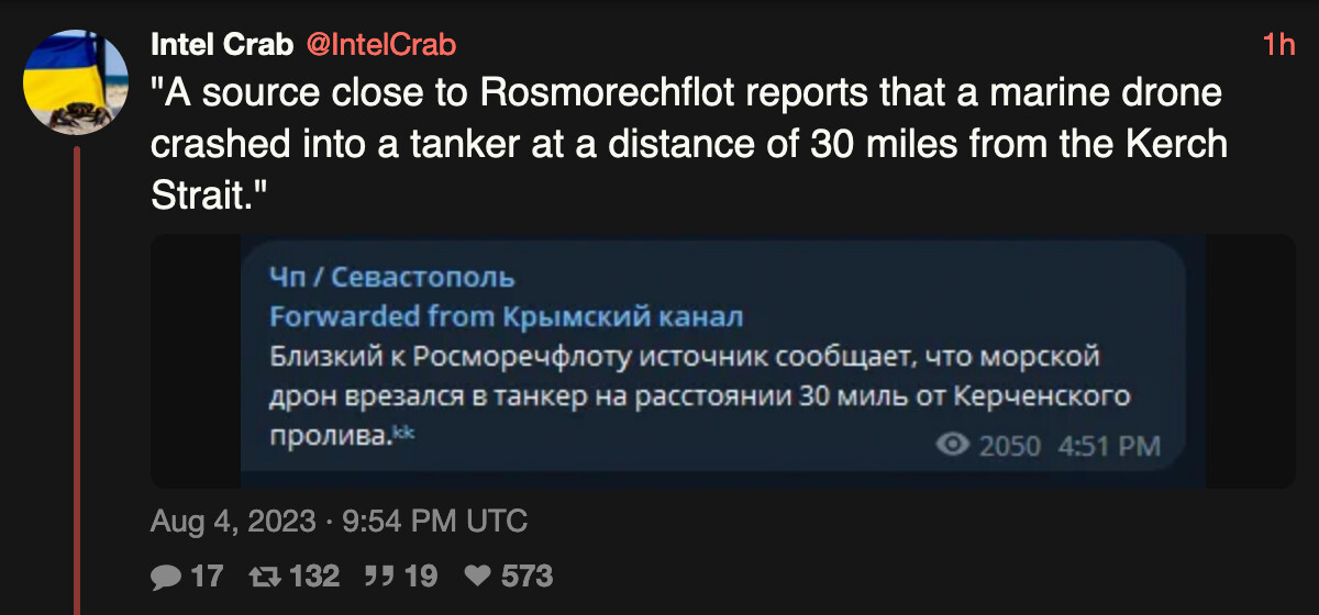 Ser ut som ukraina nå har gjort det svært lite lukrativt å frakte ting for russland. Blokaden av ukrainsk korn er nå blitt en soft blokkade av alle som hjelper russland.