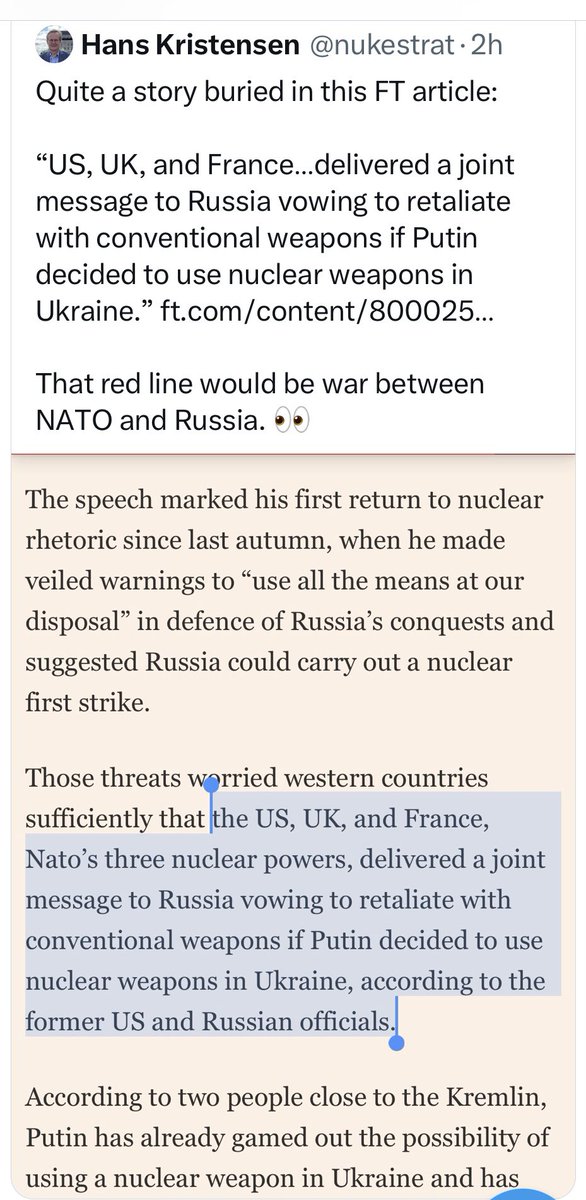 Det har jo vært etterlyst klare røde linjer for når vesten ikke lenger vil holde seg unna direkte deltakelse til støtte for Ukraina, og denne artikkelen i FT tyder på at i hvert fall en rød linje er kommunisert til kreml.