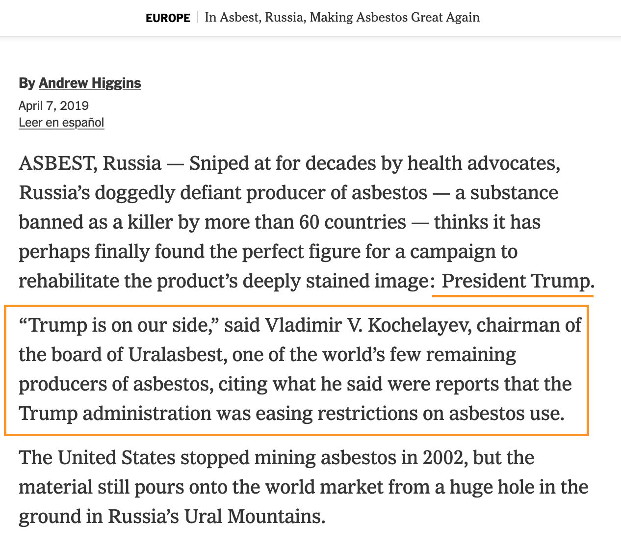 USA er ihvertfall helt klart tilbake til tidsepoken hvor asbest var et vidundermaterial, og malignant pleural mesothelioma neppe var en spesielt mye anvendt diognose.