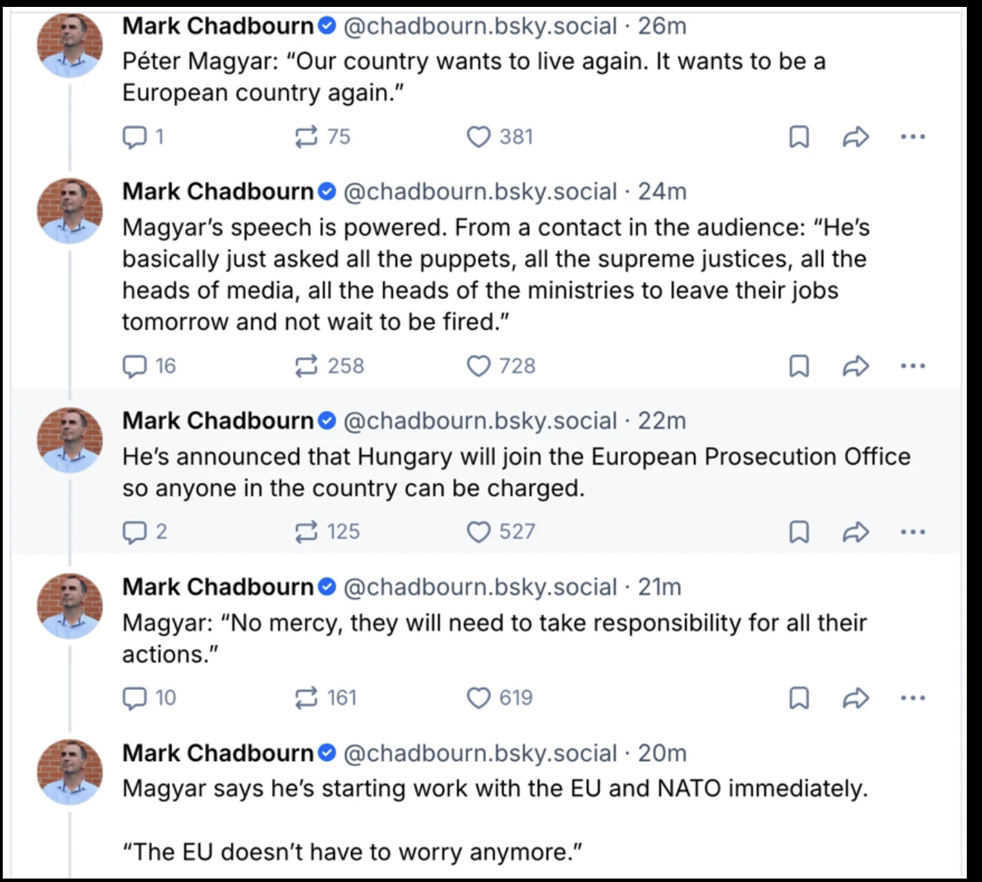 Orbán’s Concession: Magyar confirms that outgoing Prime Minister Viktor Orbán called him shortly before the speech to concede and congratulate him on the victory. Warning to the Outgoing Government: He issues a stern warning to Orbán’s caretaker government to act only in an executive capacity from this day forward. He demands they make no long-term decisions or sign contracts that would tie the hands of the incoming Tisza government. A Prime Minister for All: Acknowledging that many Hungarians (including Fidesz voters) might be disappointed, scared, or angry, Magyar promises to be the Prime Minister of all Hungarians, bridging the political divide through hard work and fair governance. (Summary generated by Gemini based on full speech)