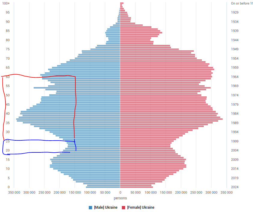 Ukraina rekrutterer fra den røde boksen og lar den blå boksen være. Problemet med 18-25 er at det er veldig små årskull.