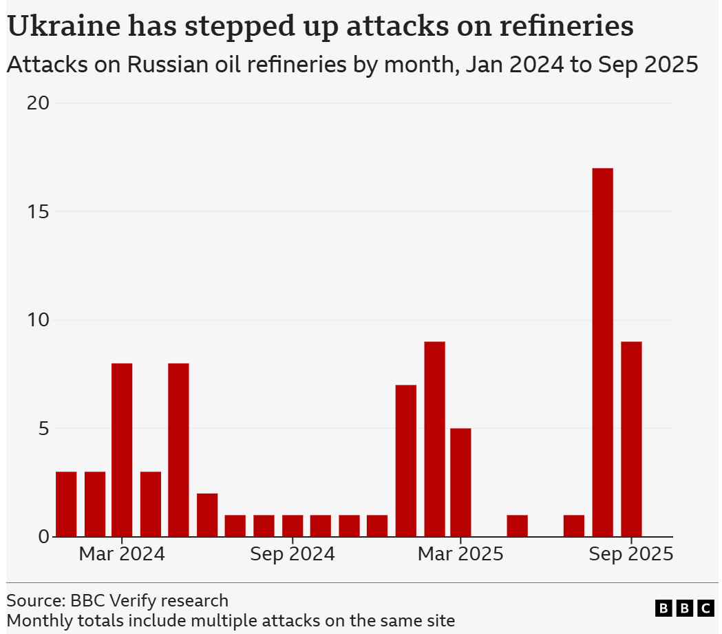 Hittil i oktober, så har de vel truffet to raffinerier og en oljepumpestasjon.