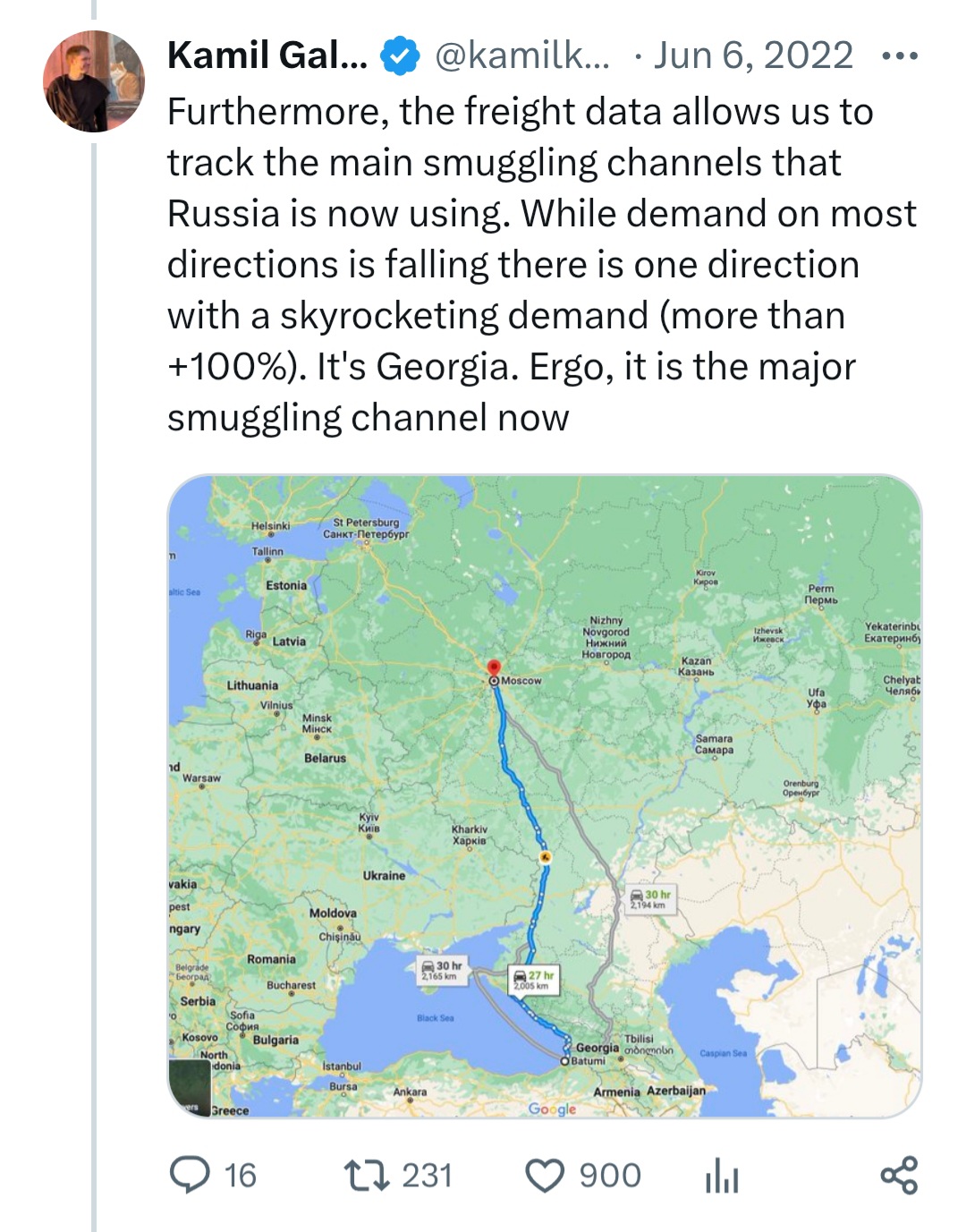 Eller “Drittland”, som det heter på tysk. Kreml legaliserte parallell import tidlig i krigen. Mye snakk i svensk media om SKF-lagerene de fant, de kom fra Tyrkia, antas det. Denne gamle tråden fra Kamil Galeev viser hvordan fraktratene falt i Russland, med 30-40%, med noen unntak, smuglerrutene.