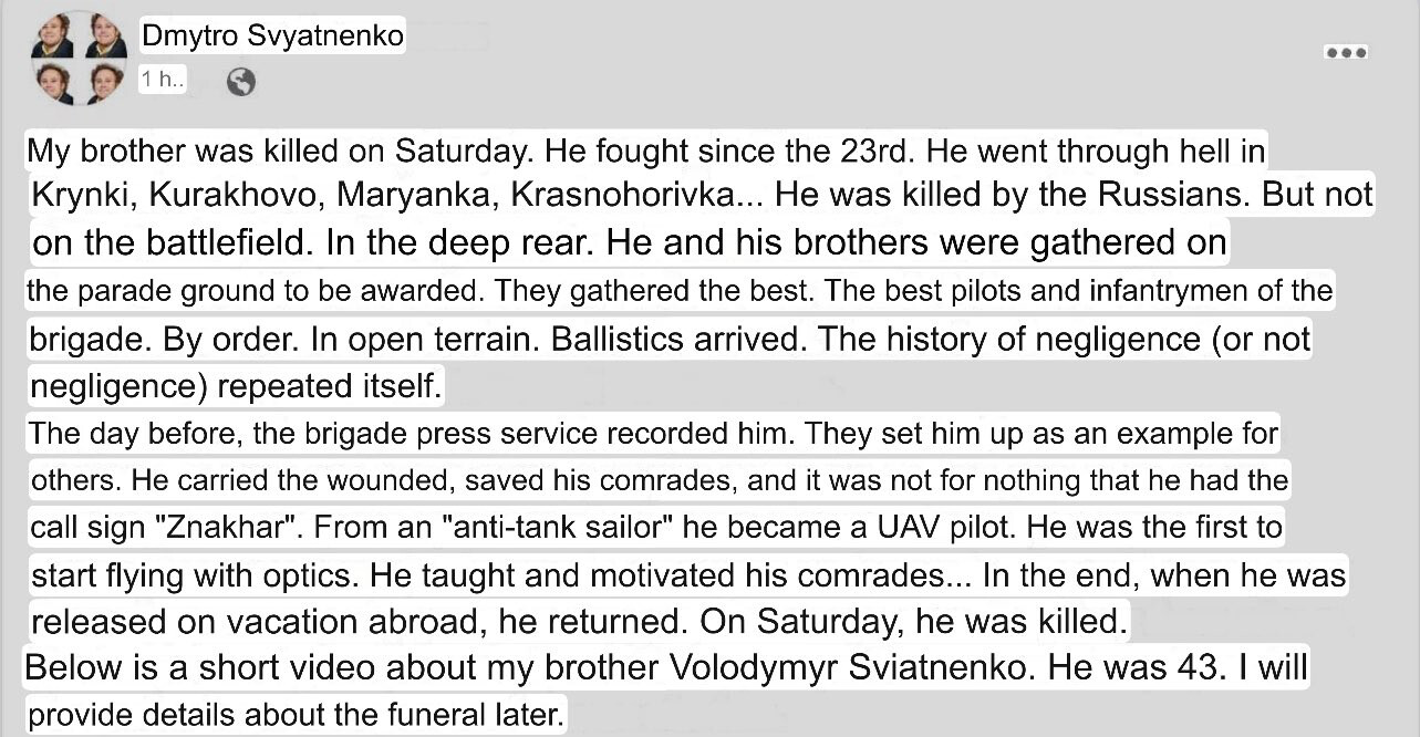 Ser ut som ukraina igjen har tapt folk fordi russland bomber en oppstilling langt unna fronten.