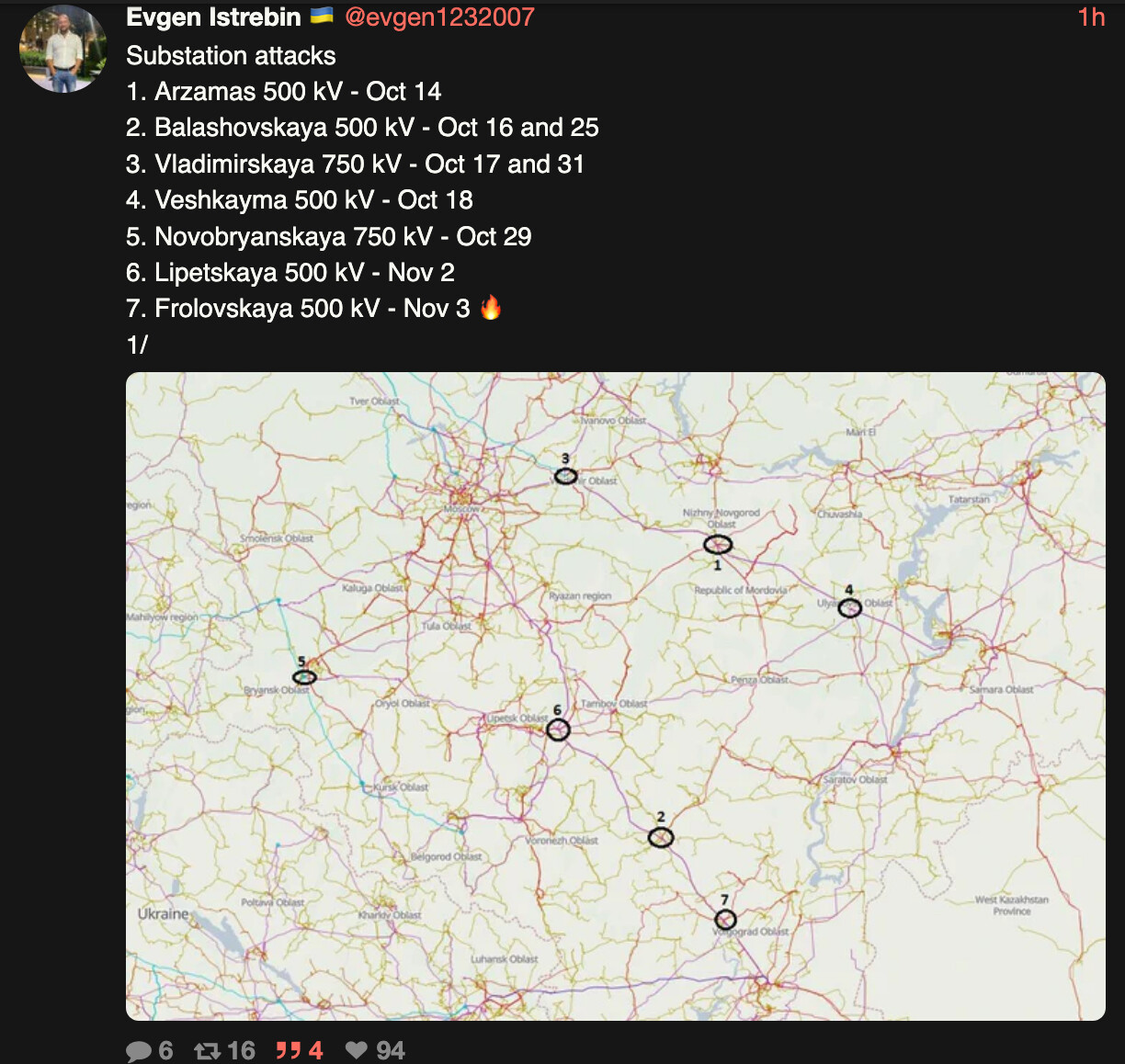 Frolovska substation (Volgograd oblast) skal være truffet: