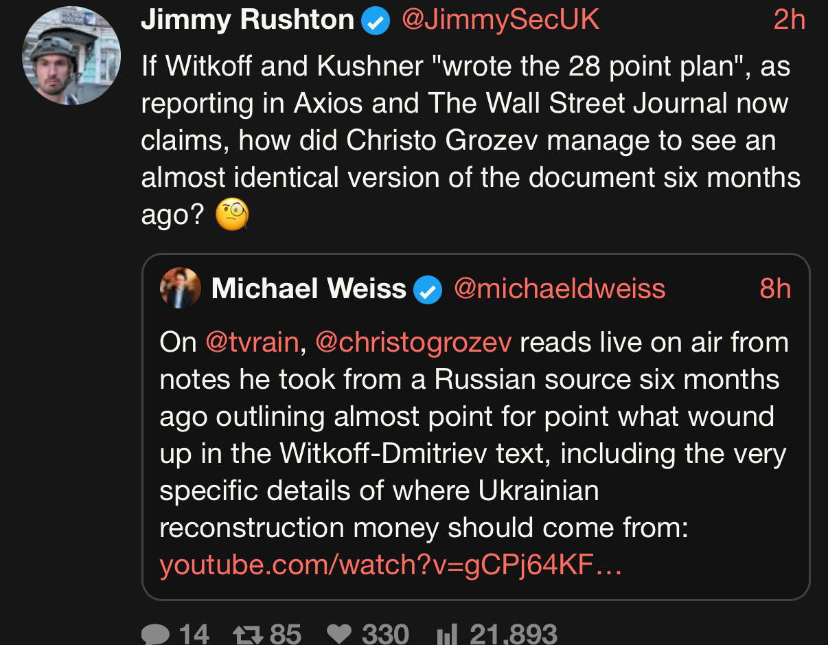 Som jeg skrev over, det er tilsynelatende mye påvirkning fra Russland-vennlige i administrasjonen, men mye mindre i senatet osv. At Marco Rubio har vært en del av forhandlingene og ikke f.eks. Vance tror jeg har vært et stort pluss.
