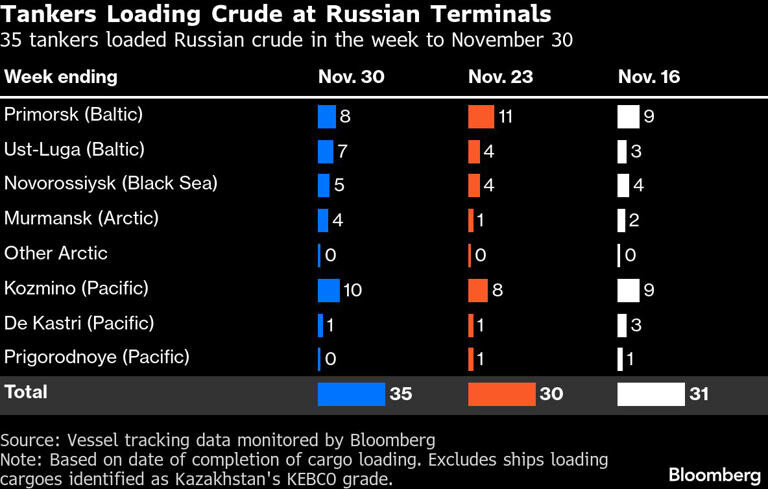 Using this measure, the export prices of Russia’s Urals from the Baltic fell by about $2.80 a barrel to $43.52, while prices for Black Sea cargoes were down by $3.60 a barrel to $41.12. The price of Pacific ESPO crude dropped by $1.90 to average $53.92 a barrel. Delivered prices in India also fell, down by $1.40 to $58.66 a barrel, a new low for the period since March 2023. All prices are according to numbers from Argus Media.