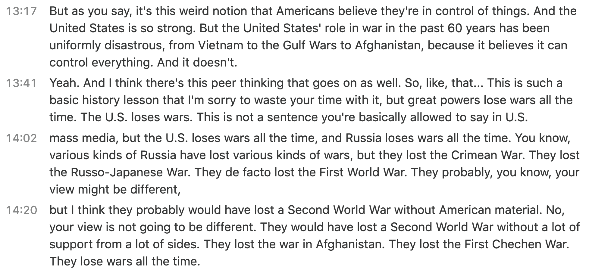 Artig at de så direkte faktisk påpeker at stormakter taper kriger hele tiden (vs “russland/sovjet vinner alt de deltar i”), og at sovjetunionen mest sannsynligvis hadde tapt WW2 uten all bistanden fra de andre allierte.