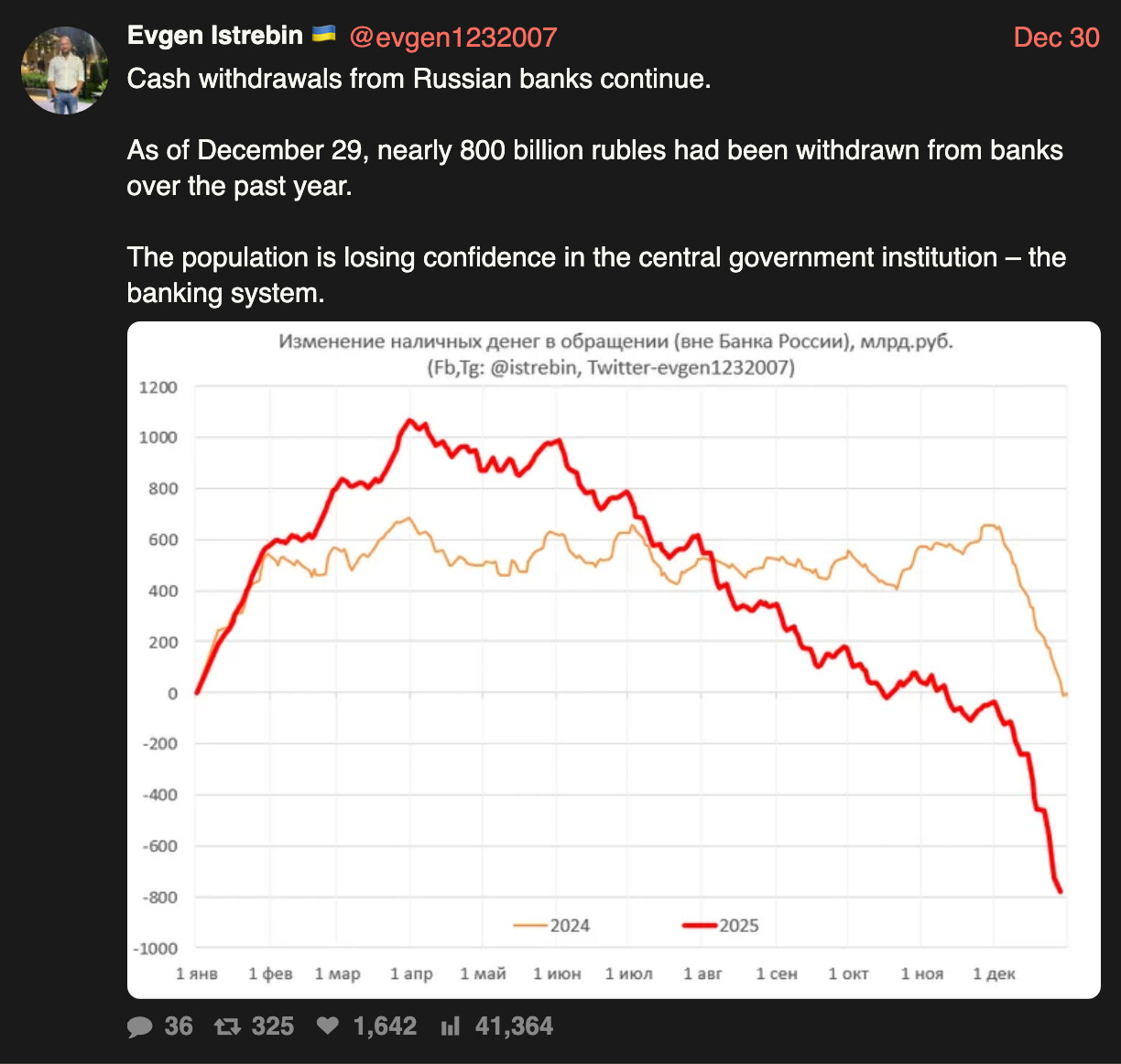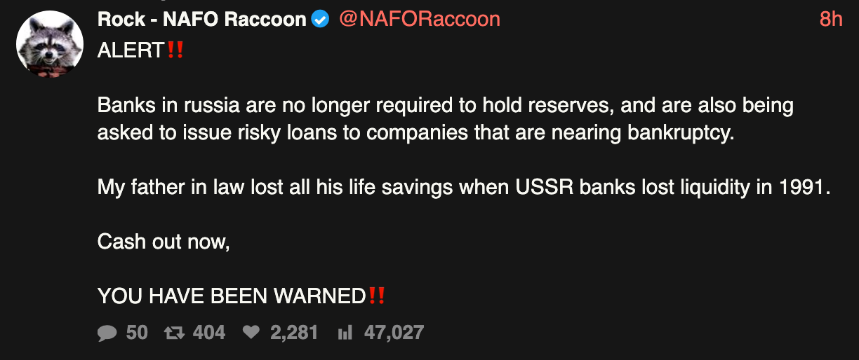 Etter det jeg forstår, er det ikke enkelt for russere å “cashe ut”. Det har i flere måneder vært kvoter på kontantuttak, og i tillegg melder flere at utakk blir hindret eller forsinket fordi bankene angivelig vil forsikre seg om at det ikke dreier seg om svindel. (Det er til ditt eget beste…)