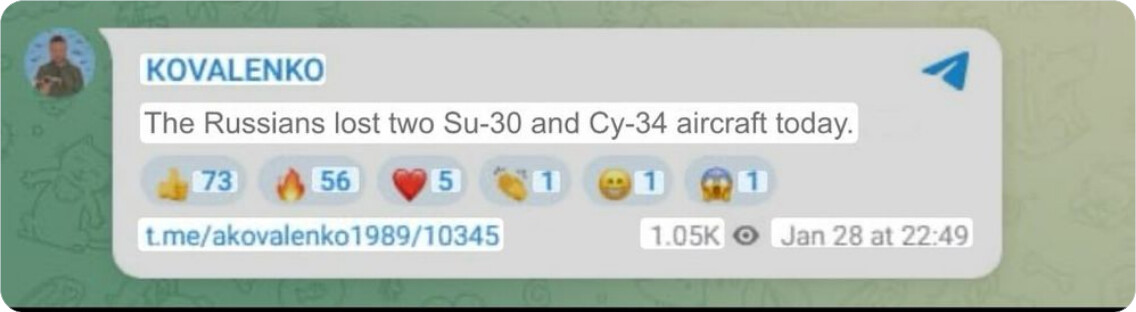 Men litt ned i artikkelen siterer de Andryi Kovalenko (leder for Ukraine’s Center for Countering Disinformation) som har skrevet på Telegram at det er 1 stk Su-34 og 1 stk Su-30):