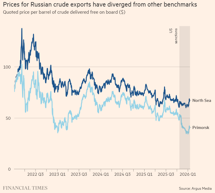 Lurte på om dataene om hvilke priser Russland får for oljen sin faktisk stemmer hos f.eks. Urals Oil - Price - Chart - Historical Data - News og utfra grafen over, så bommer de med 10-20$. Må si jeg stoler vesentlig mer på dataene FT har fått tak i.