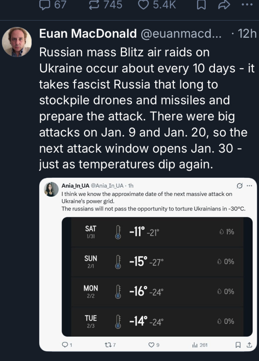 Word! Og “he will have to respond” - hva i all verden skal det bety?! Russerne bruker jo absolutt alle virkemidler og ressurser de har bortsett fra masseødeleggelsesvåpen til å angripe de militære målene de klarer og terrorisere sivilbefolkningen i Ukraina allerede.