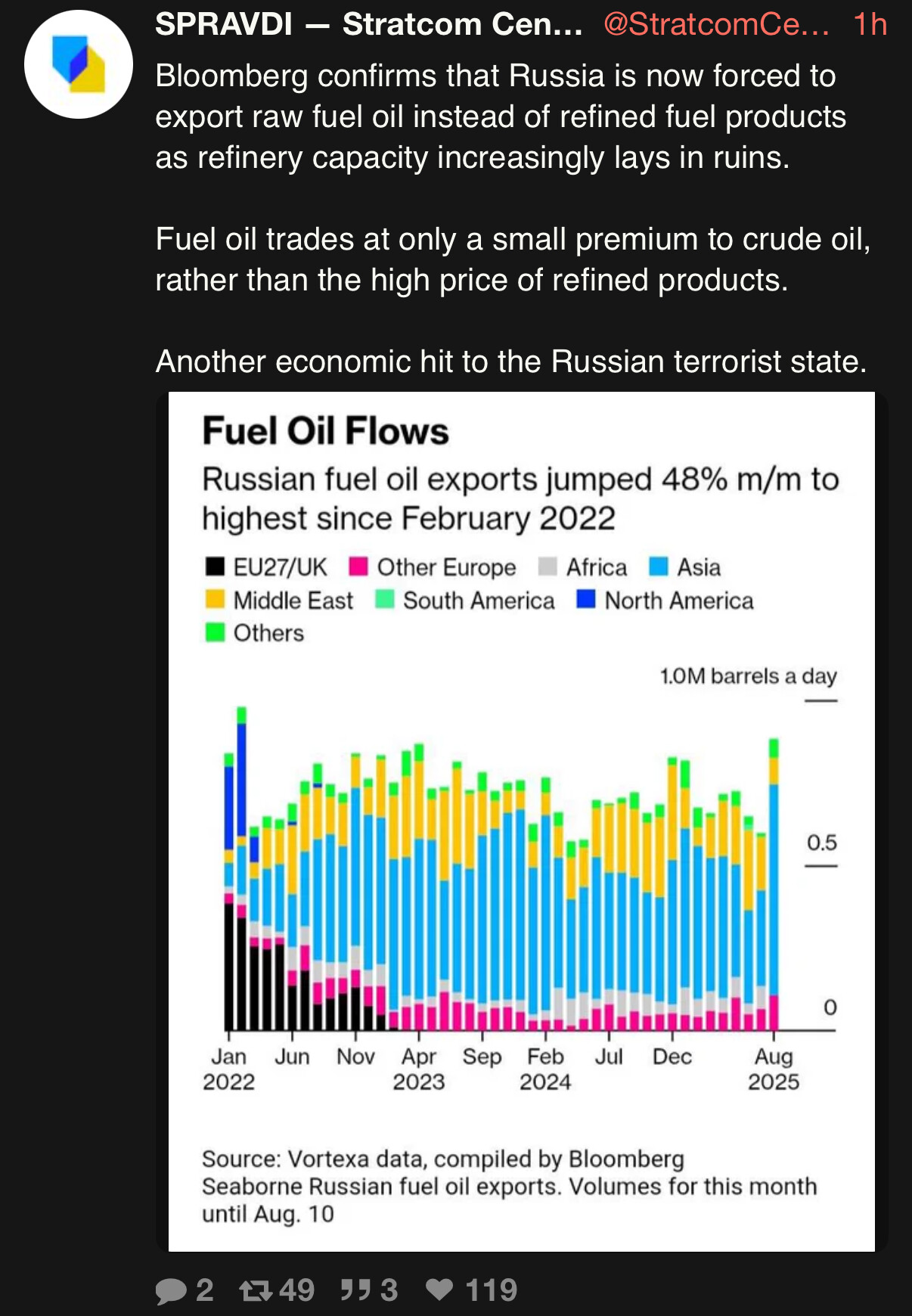 Resultatene varierer nok noe fra raffineri til raffineri og omfang av skadene. Men at noen raffienerier ikke lar seg reparere er jo en bonus for Ukriana - som du skriver tvinges Russland til å selge mer råolje og mindre destillater.