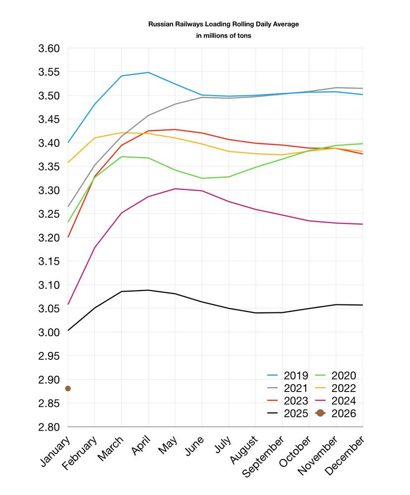 En rimelig heftig kollaps i varemengde fraktet på tog i et land hvor togtransport er særdeles viktig. Det samsvarer ikke akkurat med Russland sitt bilde av en økonomi i vekst.