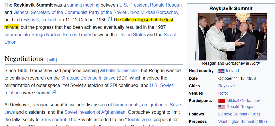 Feks når Reagan under den kalde krigen møtte Gorbatsjov i Reykjavik, ble ingenting oppnådd, og samtalene kollapset. Men i ettertiden skjedde det tydeligvis ting der. For de som er gamle nok var faktisk Sovjetunionen en ganske skummel fiende. Jeg husker i alle fall frykten fra atomkrig og atombomber. Såpass tydelig at jeg fortsatt tenker at atomkrig er skumler enn klimakrisen.
