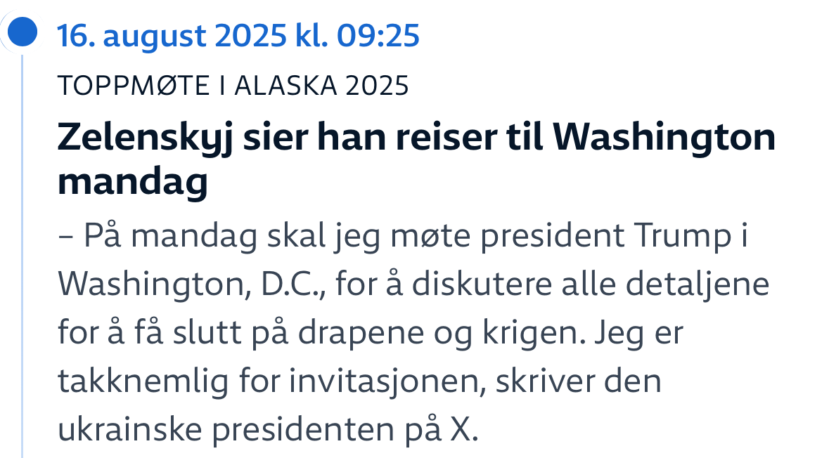Det er i alle fall min tolkning av at Trump før Alaska-møtet hadde invitert Zelensky å komme til DC mandag 18 08. Svært begrenset tid for konsultasjoner Ukraina-Europa. Presset på Zelensky i DC på mandag kommer til å bli stort.