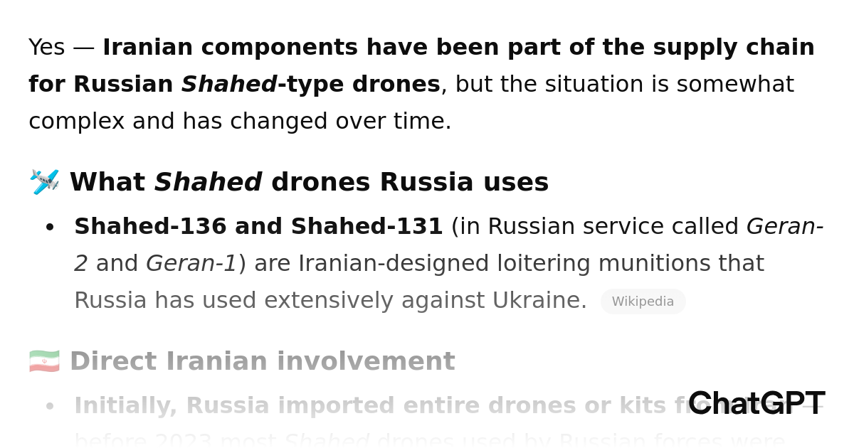 EDIT det er faktisk mulig Russland fortsatt bruker noe iranske komponenter.