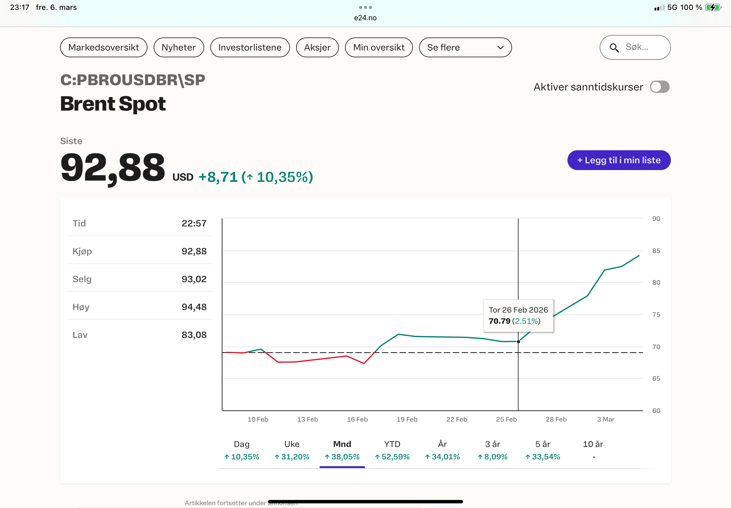 Som fremgår lå oljeprisen fredag for 7 dager siden på nivå $ 73 (før Israel/USA angrep Iran). Mandag for 5 dager siden lå oljeprisen på nivå $ 76.