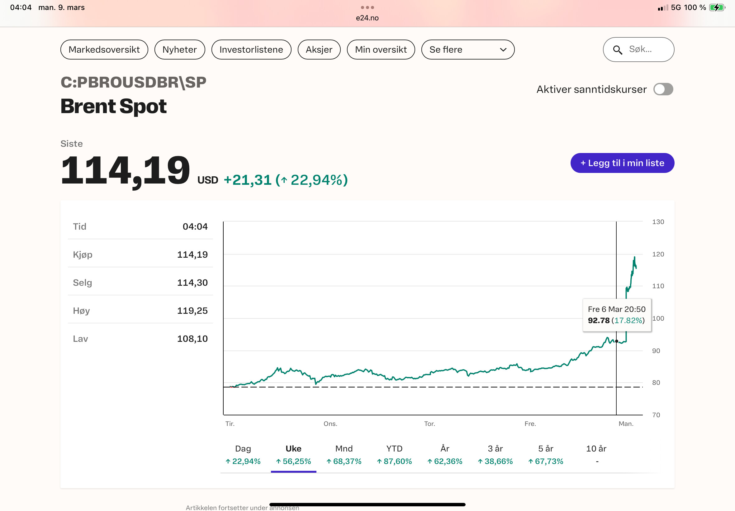 Nå natt til mandag 9 mars ligger Brent på nivå $ 114/fat: