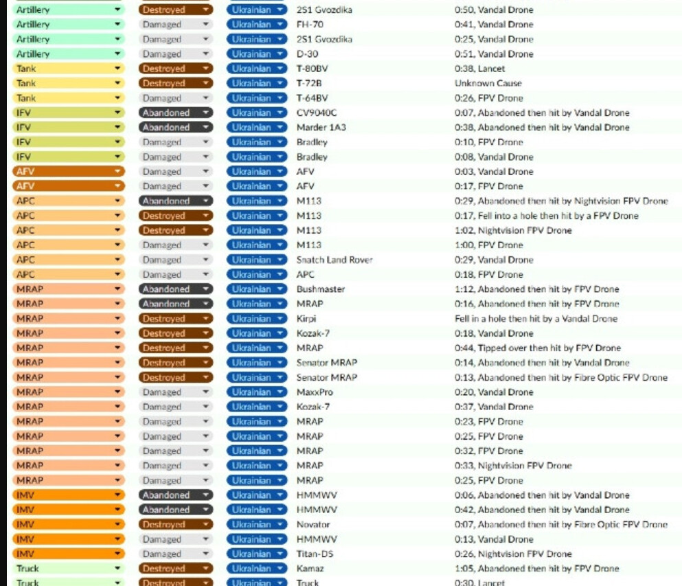 Det gikk med rimelig mye ukrainsk utstyr i går. Jeg antar det henger sammen med at Ukraina har gått på motoffensiven. Jeg kommenterte jo fra videoen med Bradley-ene at det så ut som dronemat. Står 2x Bradley på lista her som “Damaged”.