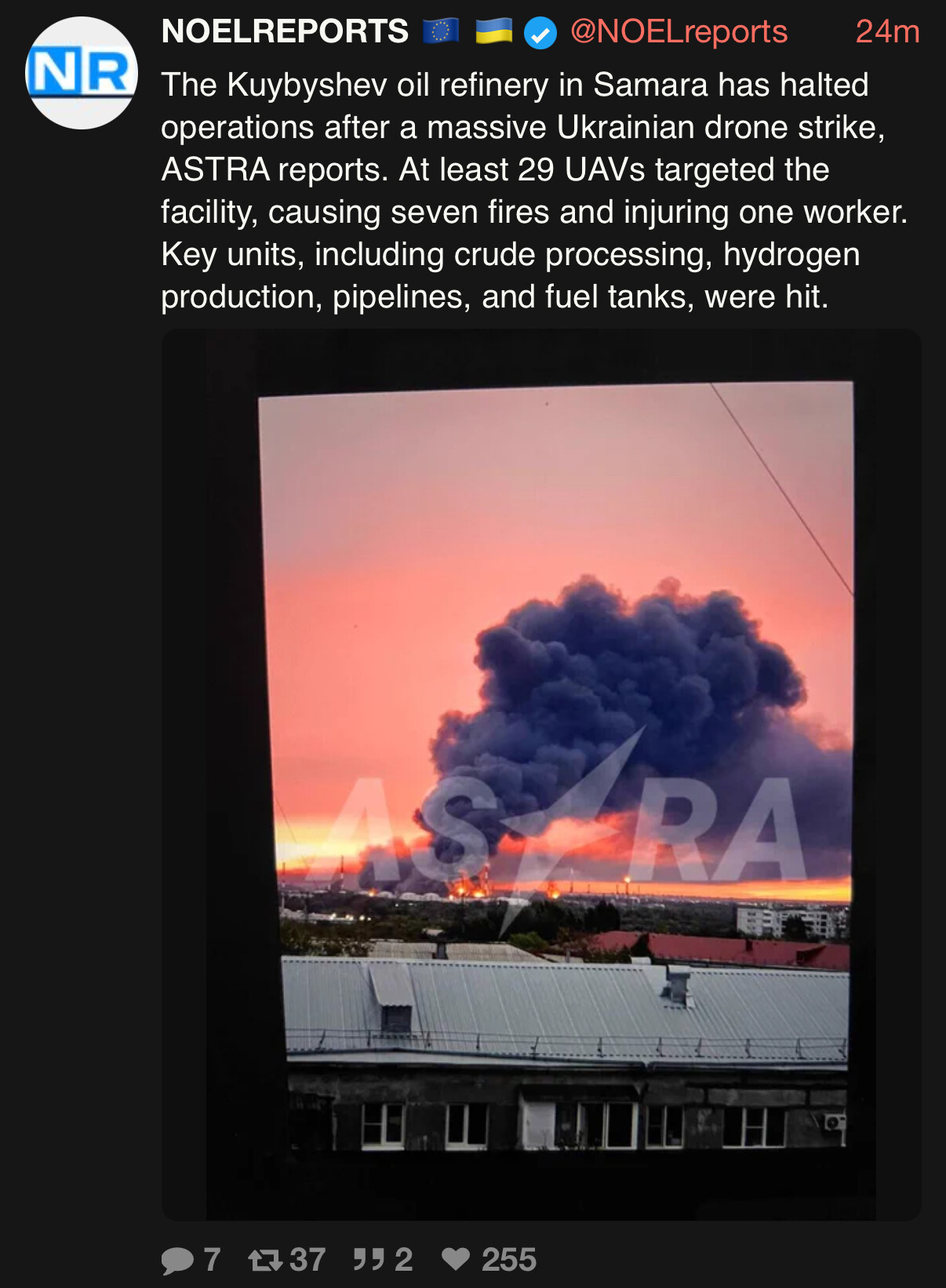 Så iflg Reuters-meldingen vil utskipningshavnen Ust-Luga operere med 50 % kapasitet i hele september måned, som følge av angrepene på rørledningen. Reuters bygger på ikke navngitte kilder i oljeindustrien.