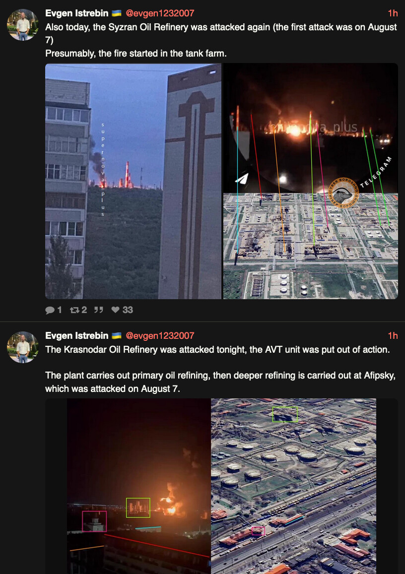 Altså de gjentatte angrepene inatt på russiske raffineriene i hhv Syzran i Samara oblast ca 700km øst for Ukraina, og i Krasnodar krai på halvøya der den berømte broen over Kerch-stredet kommer i land på østsiden.