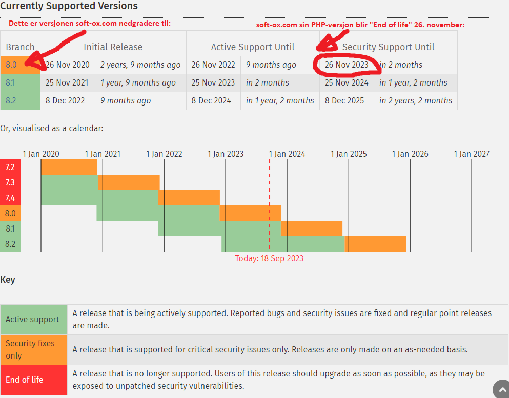 PHP 8.0.5 er ikke lenger aktivt støttet, og mottar ikke lenger sikkerhetsfikser fra 26. november 2023. Mon tro om det ikke hadde vært enklere for dem å oppgradere WordPress, utvidelser og tema jevnlig, samt deaktivere visning av PHP-advarsler, da hadde de aldri fått dette problemet - men i stedet nedgraderte de nå PHP på serveren til en gammel versjon som det straks er slutt på sikkerhetsfikser til? Idiotisk. Her er oversikt over hvilke PHP-versjoner som mottar sikkerhetsfikser: PHP: Supported Versions