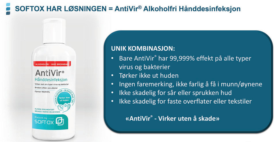 Veilederen fra FHI, som sier at alkoholbasert hånddesinfeksjon er anbefalt metode for håndhygiene innen helsetjeneste, og at det i Norge er tradisjon for bruk av alkohol til vanlig hånddesinfeksjon, har fungert som en bremsekloss. Jeg hadde en lengre dialog med et apotek i høst, dem hadde hatt et mindre parti av Antivir som var utsolgt, men ville ikke ta inn mer før det kom anbefaling, det nyttet ikke samme hvor mye dokumentasjon jeg sendte dem. Jeg har også peppret FHI med mail, å bruke “tradisjon” i denne forbindelse blir for drøyt. Hvis alt går etter planen så vil det omsider bli en endring på dette når EU-ratifiseringen er i boks, kverna maler sakte men sikkert.