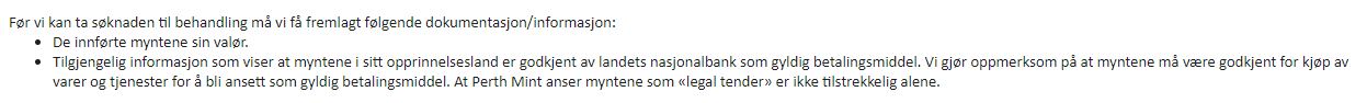 Har et par stk, men fikk problem med en jeg bestilte fra den største leverandøren i Hongkong (perth mint mynt) måtte betale moms når jeg hentet den ut i posten(greit nok) Men, når jeg sendte krav om refundert moms fikk jeg beskjed om at jeg måtte dokumentere at mynten var legal tender i opprinnelse landet. Jeg sendte link fra perth mint sin hjemmeside om at de var godkjent, men det var tydeligvis ikke godt nok. Snakket med Tavex, og de mente det var bullshit, men jeg fant ikke noen gode kilder tilstrekkelig for tollen