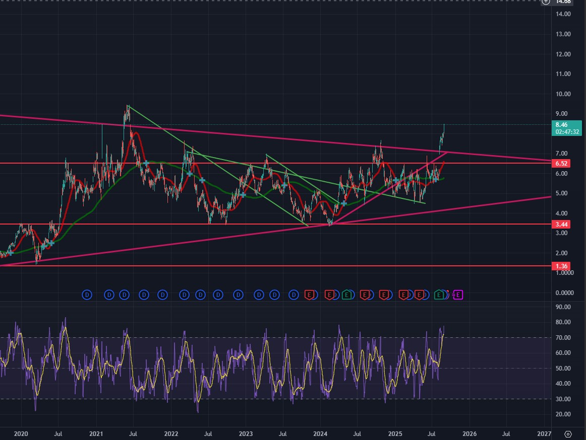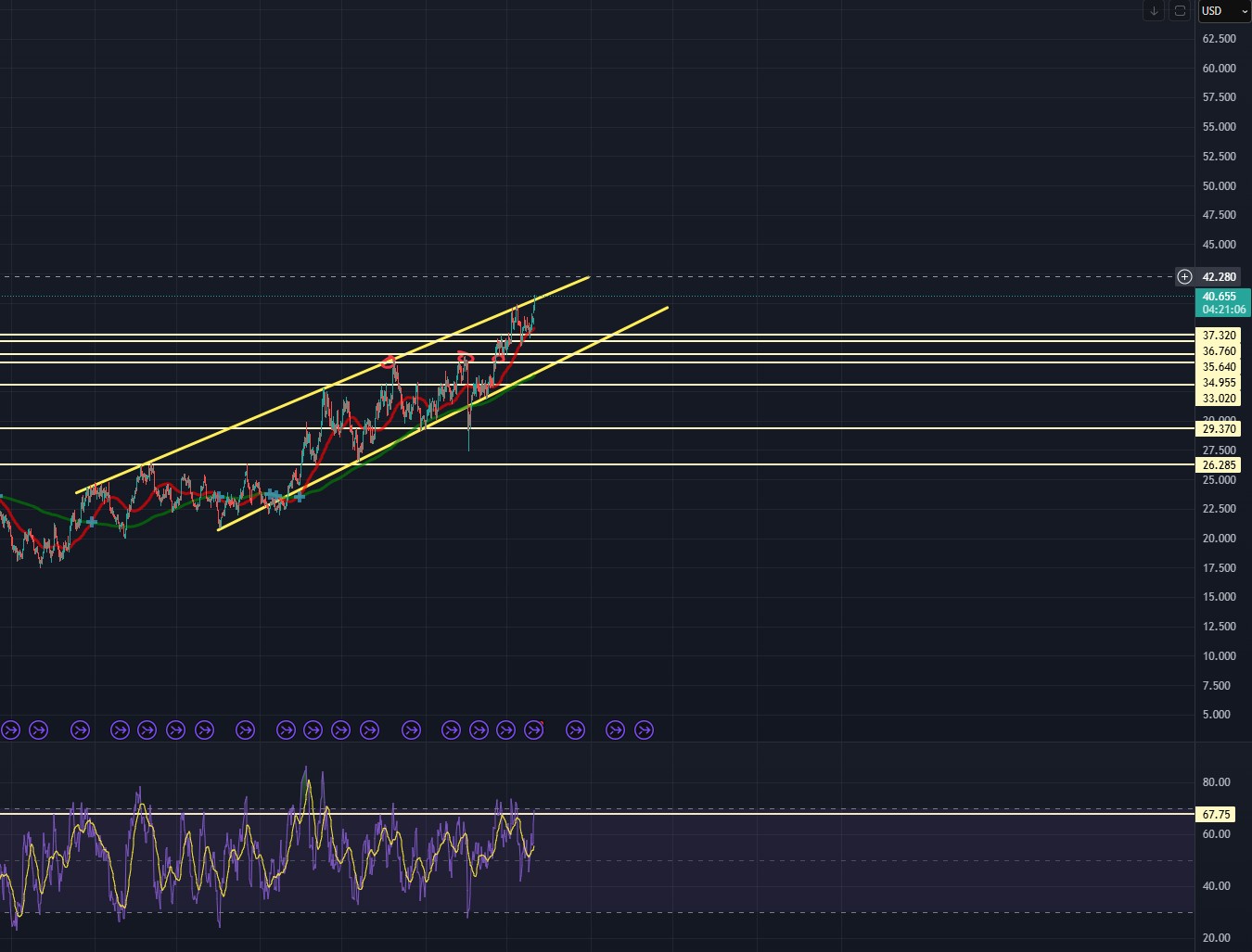 Som nevnt i hele år tror jeg vi topper ut rundt 50 dollar i år. Optimalt sett etter min mening håper jeg vi kommer dit i så sakte tempo som mulig mtp de tekniske oppsidene det vil bringe senere. Liker det jeg ser på chartene til både gull, og sølv her med konsolidering, og akkumulering sakte, men sikkert. Fortsatt ingen tegn til retail fomo eller noe. Ja teknisk sett er vi overkjøpt på RSI på de lengre timeframene, men veldig godt tegn når vi er i et bullrun (som vi helt tydelig er)