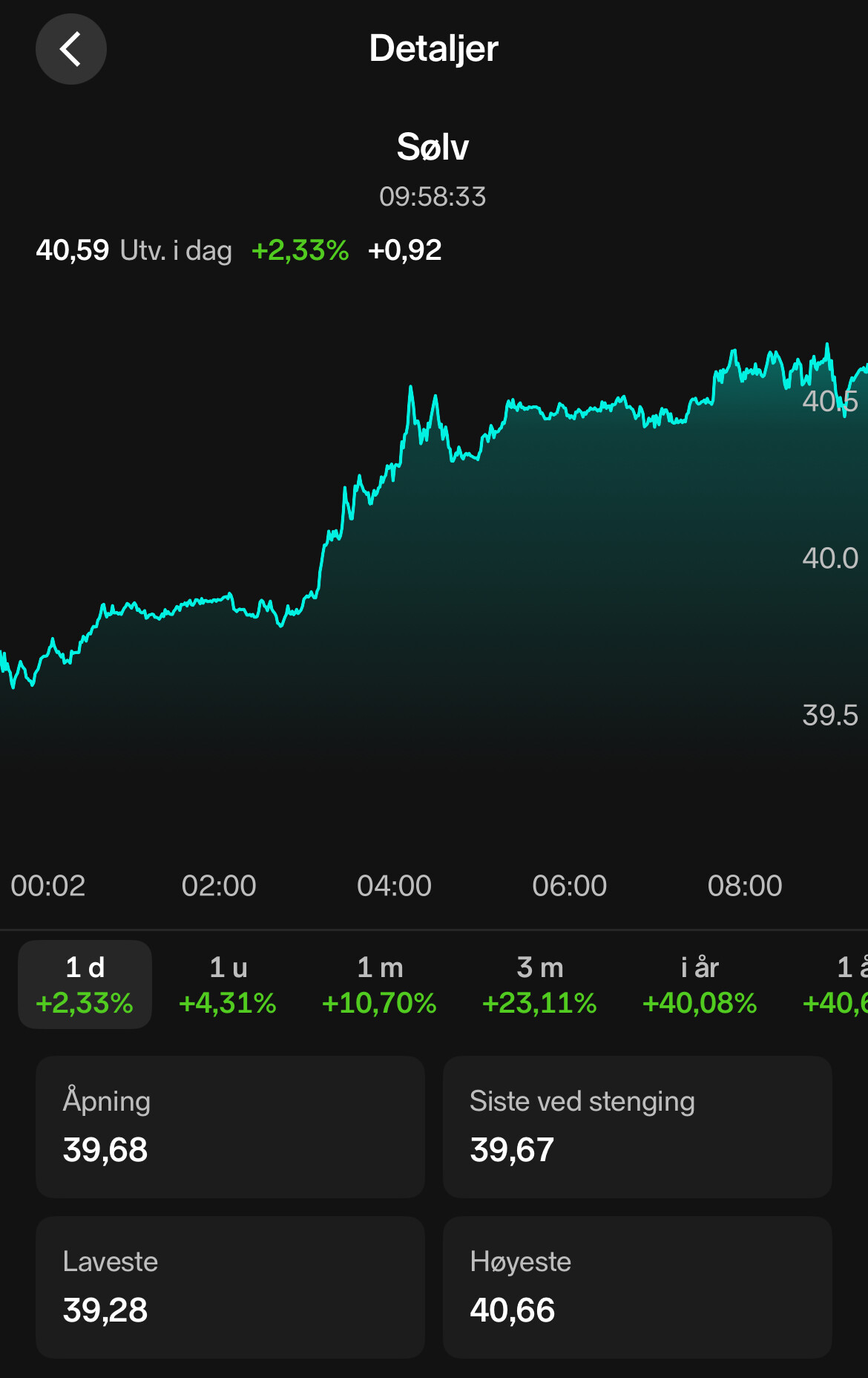 Jeg forholder meg til prisen på Nordnet, som er identisk med bullionvault, kitco, silverprice og goldprice sine priser.