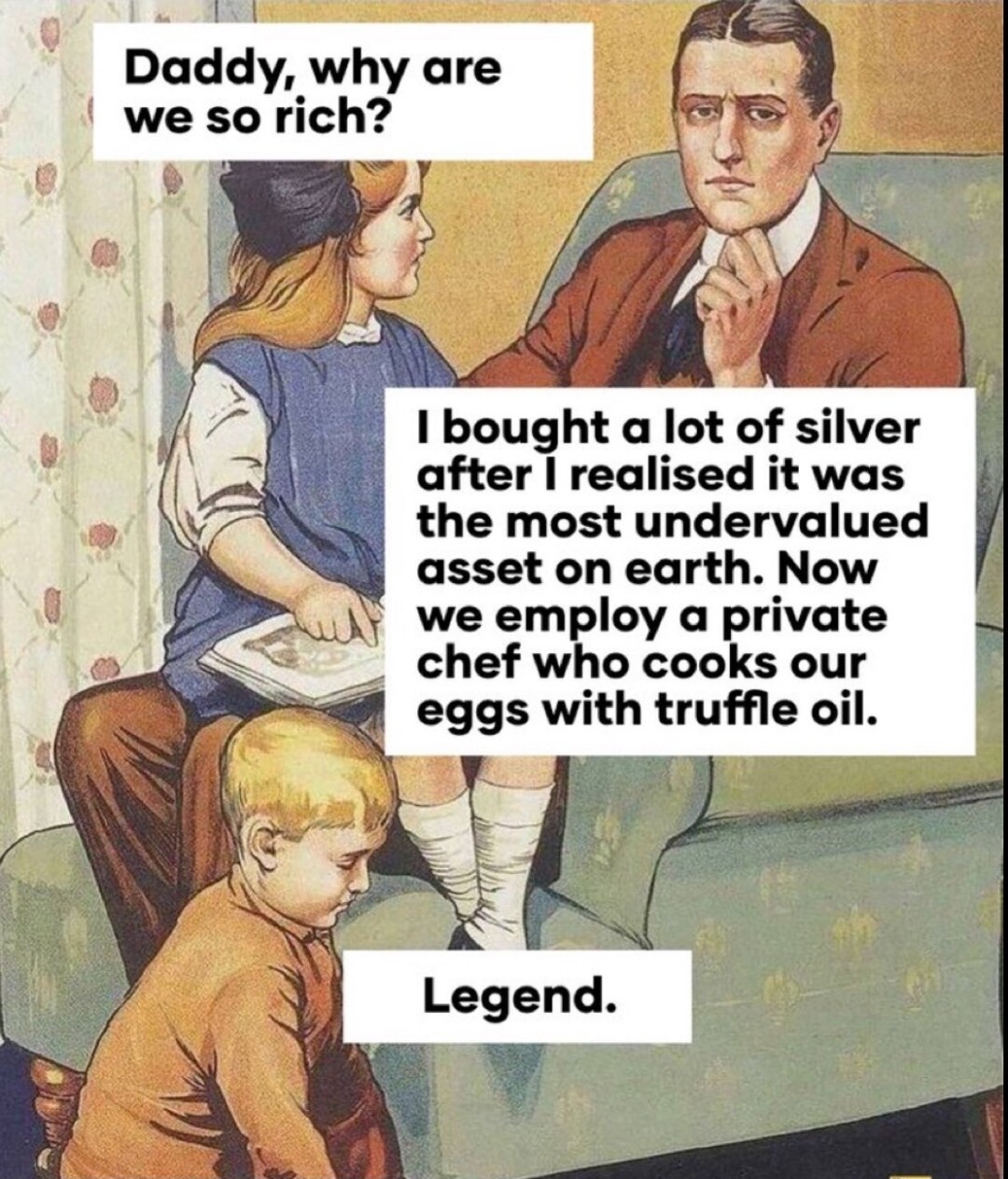 Er ikke uenig i at man skal investere i gull og sølv, men det går jo opp fordi “flight to safety”, og desto mer ustabilt alt blir desto mer og flere kjøper det som best bevarer kjøpekraft og holder verdi gjennom århundrer. Mer ustabilitet, høyere gull/sølvpriser. Alt rakner = “uendelig” verdi på gull/sølv.