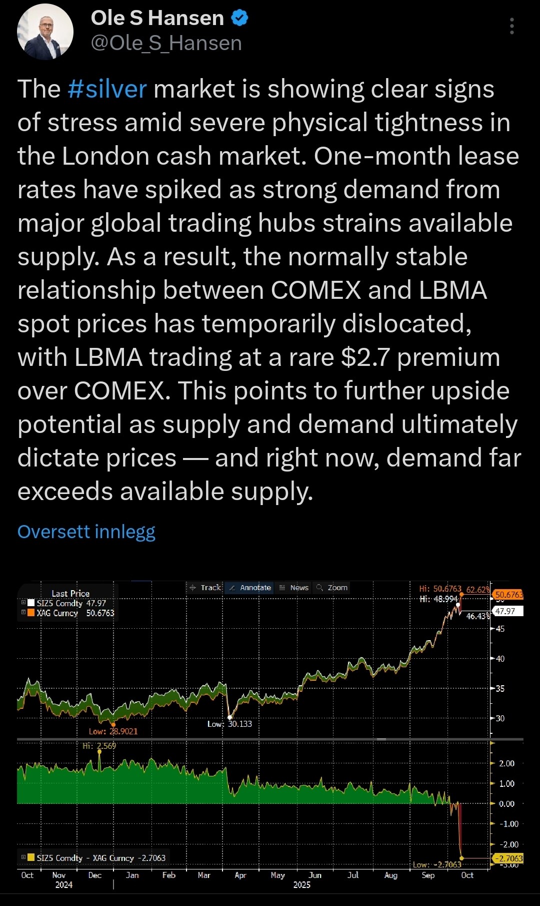 Dersom ETF-veksten i hovedsak ble dekket av ny fysisk tilførsel, kunne man ventet en tydeligere økning i LBMA-volumene i og med at eft beholdning ikke er tilgjengelig for salg. Når det ikke skjer, samtidig som markedet viser tegn til backwardation, kan det tyde på at prisbevegelsen henger sammen med begrenset tilgang på fysisk metall.