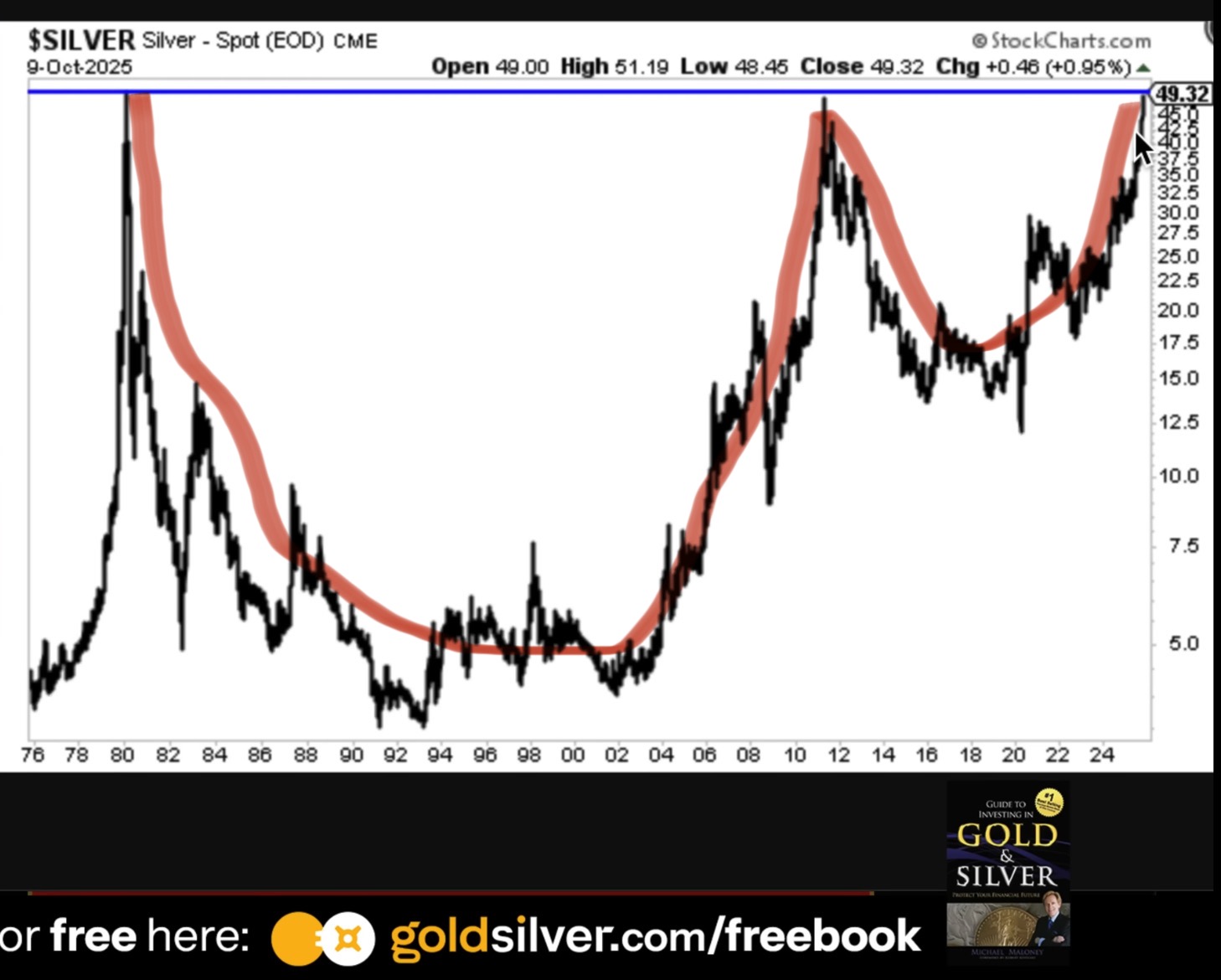 Mike Maloney fra GoldSilver.com har i åresvis snakket om når sølv kommer til å eksplodere. I følge han ble cup-and-handle formasjonen som har formet seg over 45 år, brutt denne uka da sølv gikk over 49,5 ish. Han spår minimum 100$, mest sannsynlig «mid tripple digits» fremover.
