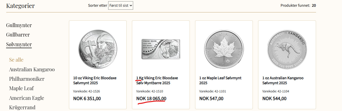 Dvs at spotpris på sølv er 32,15oz*48,59$*10,02 kroner per dollar = 15 665 kroner kiloen.