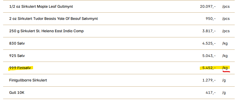 Jeg gjetter på at folk har gått mann av huse, og leverer inn alt av sølv slik at smelteovnen til KA Rasmussen er fullbooket, men hvorfor 5452,- kroner kiloen for fintsølv?