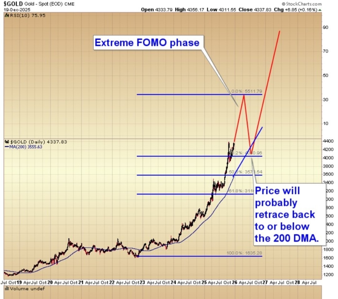 Tanker teknisk. Gull på vei til å bryte opp. Target 5200-5500 innen april/mai 26 og sølv rundt 100 ? Full Fomo. Etterfulgt av en kraftig korreksjon før veien går videre opp ?