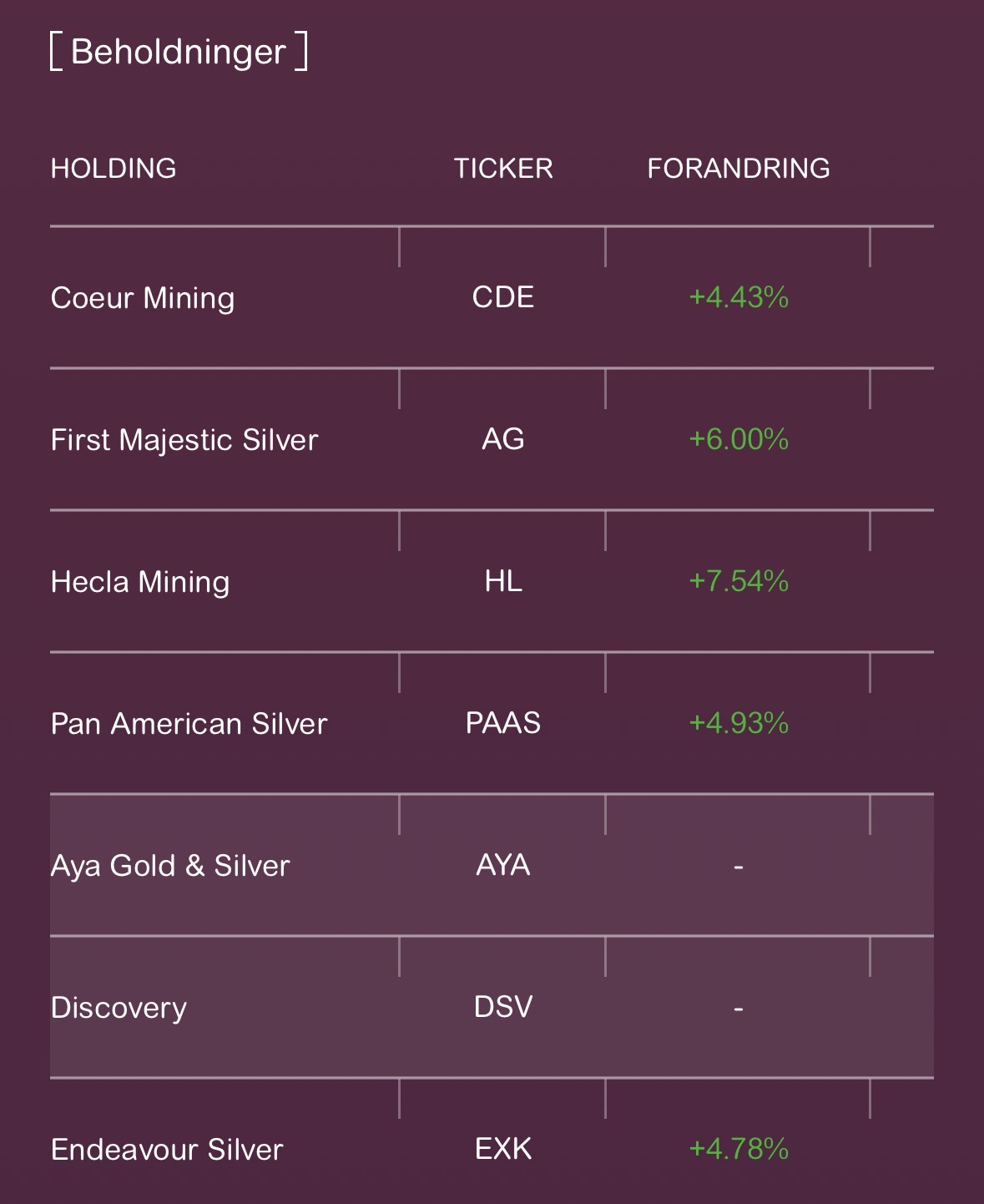 Finnes det oversikt over hvor mye % sølv, gull, kopper det er i fondet totalt.