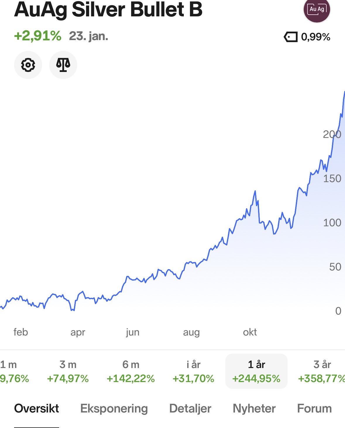 Endelig har auag silver bullet blitt tilgjengelig i DNB. Og jeg da tenkt å sette opp fast ukentlig sparing i det fondet. Men er det kanskje litt sånn at man er sent ute til festen nå eller? Jeg har fulgt med i lengre tid, men aldri tørt å satse pengene i dette. Men nå ser det bare laterlig å sitte på sidelinjen.